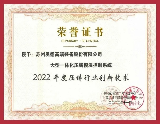 回首2022年,奧德在壓鑄模具溫度控制產(chǎn)品的種類上進?了細化和優(yōu)化升級,推出升級版的200℃/180℃?溫機、模具冷卻站、冷熱恒溫站、模溫集成控制系統(tǒng)等相關(guān)產(chǎn)品,覆蓋了?體化壓鑄模溫控制所需的所有設(shè)備,實現(xiàn)了20℃~320℃的大寬幅可調(diào)溫區(qū),給模具溫度平衡提供穩(wěn)定且可控的溫度源輸出。同時,奧德的“大型一體化壓鑄溫控系統(tǒng)”獲得了由中國機械工程學(xué)會鑄造分會、鑄造行業(yè)生產(chǎn)力促進中心評選的 “2022年度全國壓鑄行業(yè)創(chuàng)新技術(shù)與產(chǎn)品”稱號,蘇州奧德高端裝備股份有限公司獲得了江蘇省“專精特新”企業(yè)。