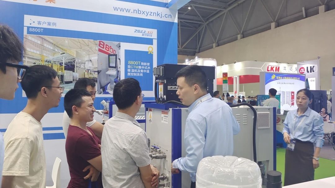 新昱科技銷售總監(jiān)劉傳臺,為專業(yè)觀眾介紹產(chǎn)品 新昱科技將原來的數(shù)十臺水溫機(jī)分別控制,改為集中溫控并分為低溫區(qū)5-35℃、中溫區(qū)50-120℃、高溫區(qū)120-160℃三大溫區(qū),同時實現(xiàn)控制系統(tǒng)集成,集中于一臺CTM中央水路控制系統(tǒng)。CTM采用分體式結(jié)構(gòu)設(shè)計,控制箱直接放置在模具旁,并且可實現(xiàn)間歇性供水,反應(yīng)速度快,管理集中輸送,數(shù)量少,方便做管路保溫,最大化地減少管路熱量損失。另外, CTM的輸送壓力在10公斤以上,輸送效率更高,熱傳遞速率提升近一倍。