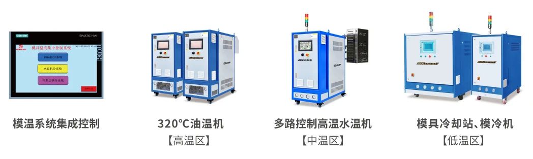 奧德大型一體化壓鑄溫控系統目前可實現20℃至320℃的大寬幅可調溫區,給模具溫度平衡提供穩定且可控的溫源輸出,同時大幅度的溫度輸出不僅僅可以對模具進行溫度平衡控制,還可以延伸至對壓室、沖頭、分流錐、澆口套等進行溫度控制,因此留給了現場壓鑄產品工藝師足夠的操作余地,獲得廣泛用戶的認可。 3.0版本的壓鑄溫控系統包括一系列高溫、中溫、低溫溫控產品(320℃油溫機、180℃集成多通道高溫水溫機、模具冷卻站、集成控制系統),其中壓鑄專用多通道高溫水溫機作為新一代節能產品,通過大流量、多路獨立控制的系統,既能夠滿足多通道不同的溫度控制需求,又可實現一機多用,減少對水溫機的使用數量。