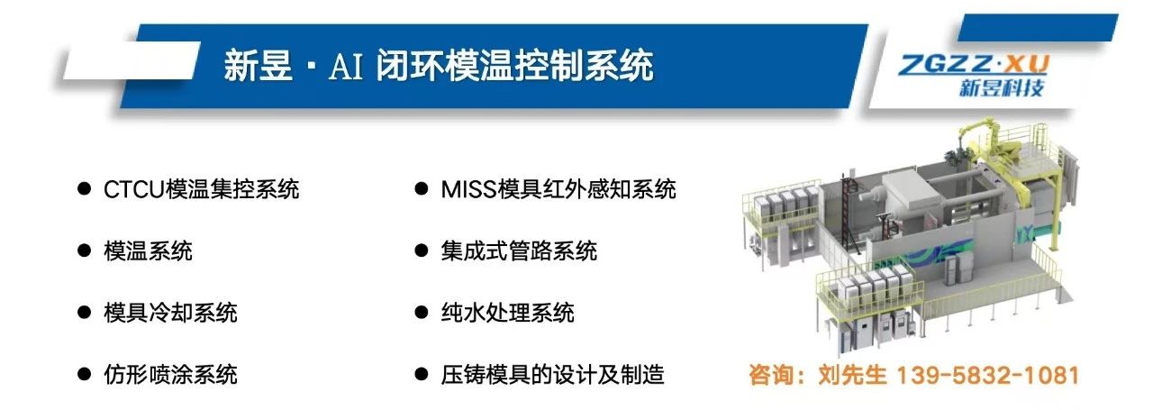 壓鑄模溫智能閉環溫控系統 經實際生產環境驗證,ThermLoop展現出了“快”、“準”、“穩”的控溫能力。以下將簡要從這三個方面介紹ThermLoop的自主控溫能力: (1)異常模溫響應快:在識別到模溫異常時,系統將提前快速響應并計算溫控參數,將模溫控制在標準溫度范圍內,避免響應過慢導致模溫超出標準范圍后才進行調節。在面對模溫驟變的情況下,系統能夠在1模次內快速響應,調節參數,控制模溫。 (2)控制精度高:壓鑄工程師可自定義目標模溫,系統進行自主調控。在溫控能力充足的情況下,系統能夠將模具溫度調控至目標溫度,達到模溫熱平衡,并保持連續生產。實際模溫與目標模溫的平均誤差小于±3%,實現“指哪打哪”的精準控溫效果。 (3)穩定性強:ThermLoop的魯棒性表現非常強,在面對停機、鋁液溫度變高以及其他特殊情況時,系統算法會自動識別現場異常情況,結合歷史控溫情況進行決策和計算,保障模具溫度保持穩定,確保生產的連續穩定。 此外,ThermLoop能夠結合歷史數據進行自主優化,從而實現更加快速準確的模溫控制效果。 關于新昱科技 新昱科技是一家專注于大型一體化壓鑄車身熱管理系統的企業,其所有溫控設備均為自主研發,且在國內市場上,新昱科技的溫控設備種類最為全面。公司深耕壓鑄行業,擁有一套完整的智能溫控系統。 其子公司東臨模具成立于2021年,是一家專業從事高精密壓鑄模具開發、設計與制造的公司。作為新昱科技的子公司,東臨模具與新昱科技攜手并進,旨在將溫控技術和模具技術高度融合,致力于系統化解決壓鑄汽車件良品率低、生產效率低、節拍慢、成本高等難題。 目前,兩家公司已搬遷至位于浙江省寧波市杭州灣新區眾源路的新建廠房,廠房面積達25000㎡。