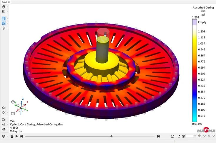 圖1:特別是在幾何體、網格和結果界面,新的工具欄按照功能精簡并分組,支持用戶更高效的工作 幾何界面的新功能方便用戶進行幾何體的編輯,新的三維坐標系統使用戶能夠更加直觀的旋轉和定位幾何體。在MAGMASOFT®6.0中,用戶可以在幾何界面中保存顯示設置,并在幾何界面和其他界面使用保存的顯示設置。例如,在幾何界面中預先保存重要的視圖,并在以后使用它們對結果進行(自動)評估。這有助于在項目開始時就能更快、更有效地進行鑄造和工藝開發。 MAGMASOFT®6.0的項目加載時間縮短了80%,這有助于他們在單個項目或項目版本之間更快速地切換。 新的結果色標以及可視化——強大的結果評估 MAGMASOFT®6.0新增連續色標和升級版的X射線顯示,使模擬結果的評估更加真實和精確(圖2和圖3)。此外,色標的刻度值可以直接調整或用鼠標滾輪調整。