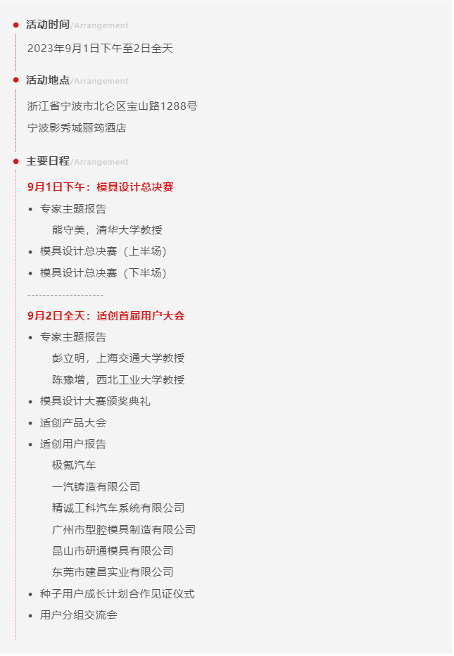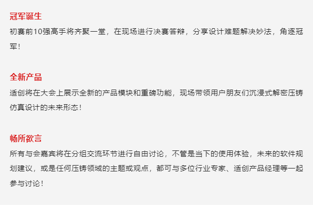 從主機(jī)廠、一級(jí)供應(yīng)商,到頭部/中小型壓鑄廠和模具廠,眾多行業(yè)代表企業(yè)和適創(chuàng)科技用戶企業(yè)將紛紛到場(chǎng),共同交流經(jīng)驗(yàn),探討技術(shù)發(fā)展。